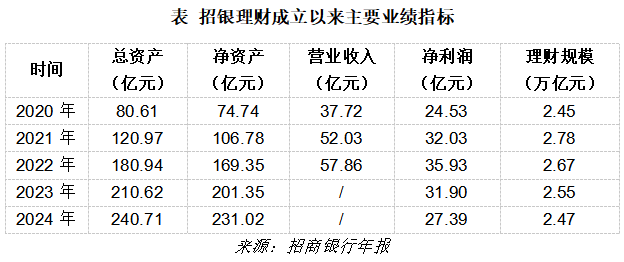 不过自2021年末理财规模达到2.78万亿元的巅峰水平之后,招银理财产品规模持续缩水,2022年-2024年末分别为2.67万亿元、2.55万亿元、2.47万亿元。