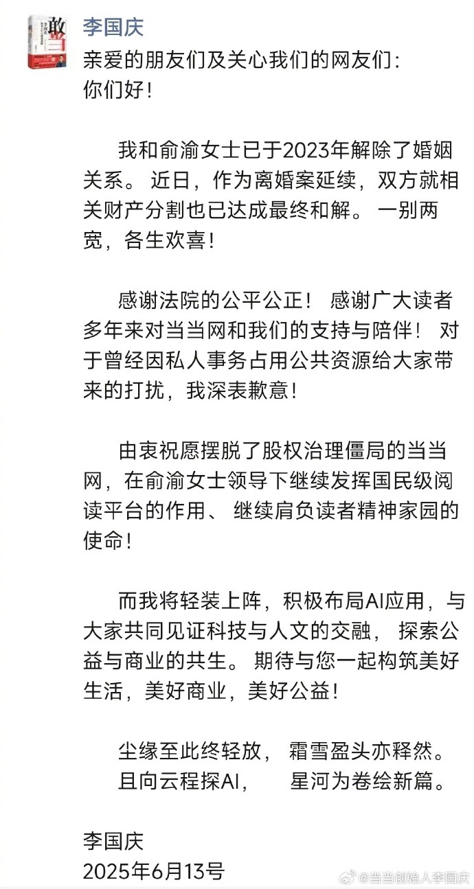 李国庆表示:“我和俞渝女士已于2023年解除了婚姻关系。近日,作为离婚案延续,双方就相关财产分割也已达成最终和解。”他同时向公众致歉,称对“因私人事务占用公共资源给大家带来的打扰”深感歉意。