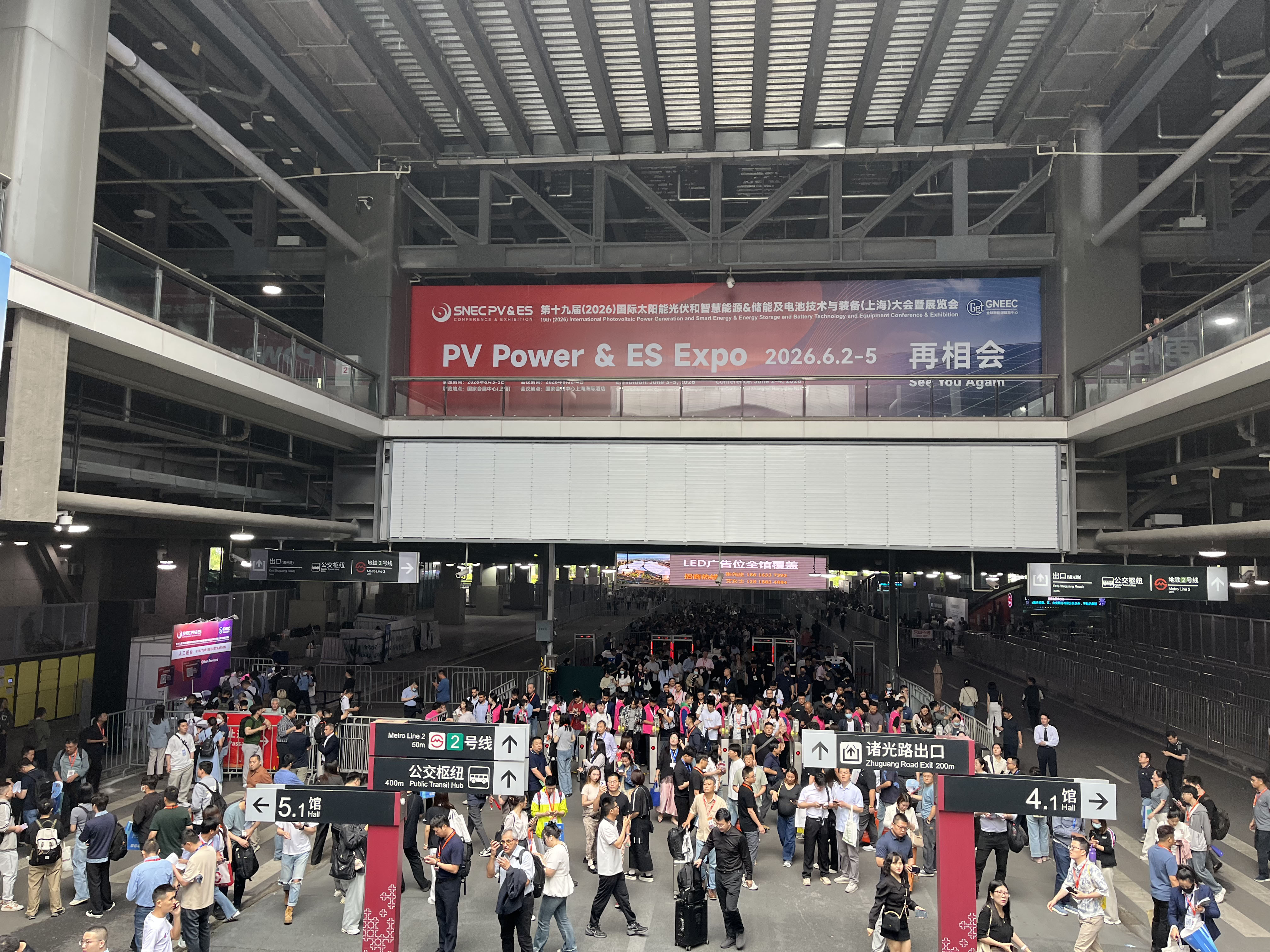 11号是正式开展第一天,界面新闻记者早上来到国家会展中心时发现,与以往年不同,今年展馆外不再有铺天盖地的企业广告,最为醒目的那几块是SNEC官方宣传牌。