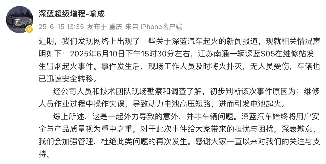 6月15日,深蓝汽车超级增程负责人喻成在微博发布声明称,2025年6月10日下午15时30分左右,江苏南通一辆深蓝S05在维修站发生冒烟起火事件。事件发生后,现场工作人员及时将火扑灭,无人员受伤,车辆也已迅速安全转移。经公司人员和技术团队现场勘察和调查了解,初步判断该次事件原因为:维修人员作业过程中操作失误,导致动力电池高压短路,进而引发电池起火。综上所述,这是一起外力导致的意外,并非车辆问题。