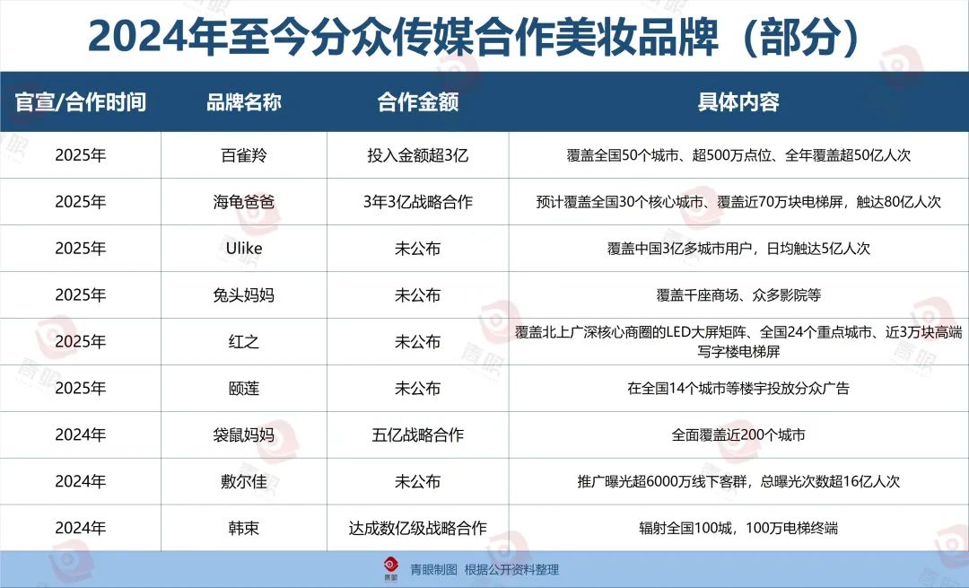 动辄投入数亿元,在美妆品牌与分众传媒的合作中并不少见。自去年至今,除了韩束、百雀羚等老牌国货外,袋鼠妈妈、海龟爸爸、松达等品牌同样斥资数亿元,与分众传媒制定长期合作计划。