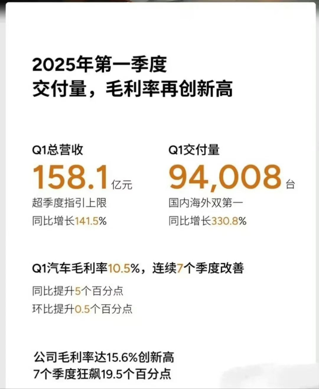 随后,小鹏如同开挂一样,火力全开。2025年第一季度,小鹏实现了总交付量超94008台的成绩,较2024年同期大幅增长330.8%,不仅创下单季度交付历史新高,也超过了一季度91000台至93000台交付的指引上限。