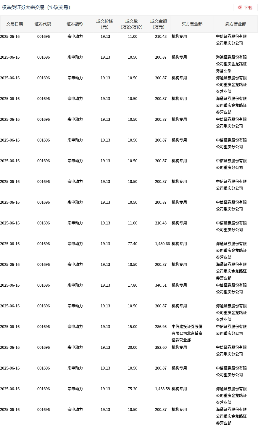 6月16日,宗申动力大宗交易成交353.4万股,成交额6760.6万元,占当日总成交额的12.28%,成交价19.13元,较市场收盘价21.37元折价10.48%。