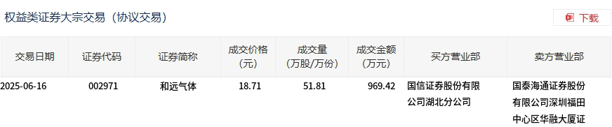 6月16日,和远气体大宗交易成交51.81万股,成交额969.42万元,占当日总成交额的22.67%,成交价18.71元,较市场收盘价21.02元折价10.99%。
