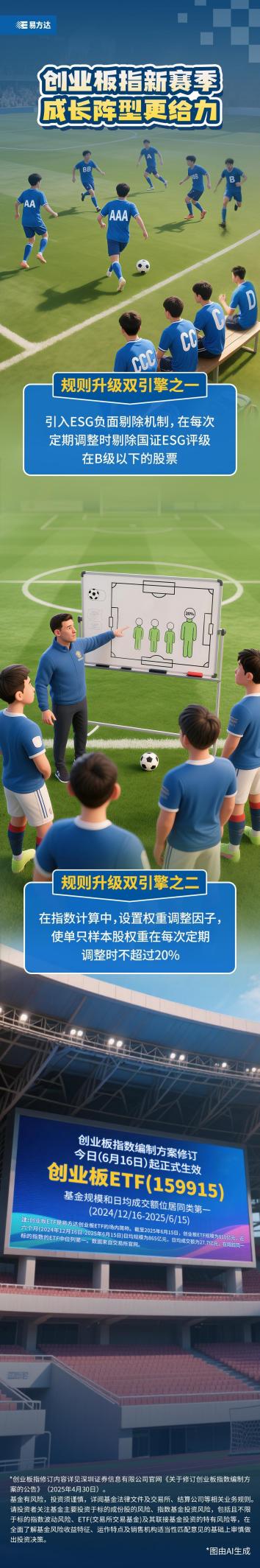 创业板指修订今日正式生效,新方案引入ESG负面剔除机制和个股权重上限机制,以降低风险和控制单股影响。跟踪该指数的创业板ETF(159915)管理费率最低,规模超810亿元,居同类产品首位,便于投资者低成本布局新兴产业,把握经济转型和产业升级的机遇。