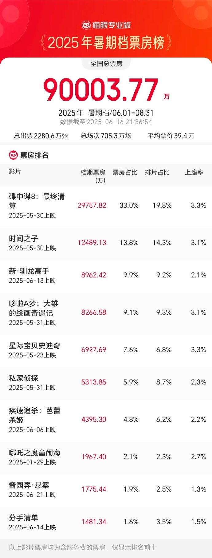 据猫眼专业版数据,截至6月16日21时36分,2025年暑期档总票房(含预售)突破9亿元,《碟中谍8:最终清算》《时间之子》《新·驯龙高手》分列暑期档票房榜前三位。