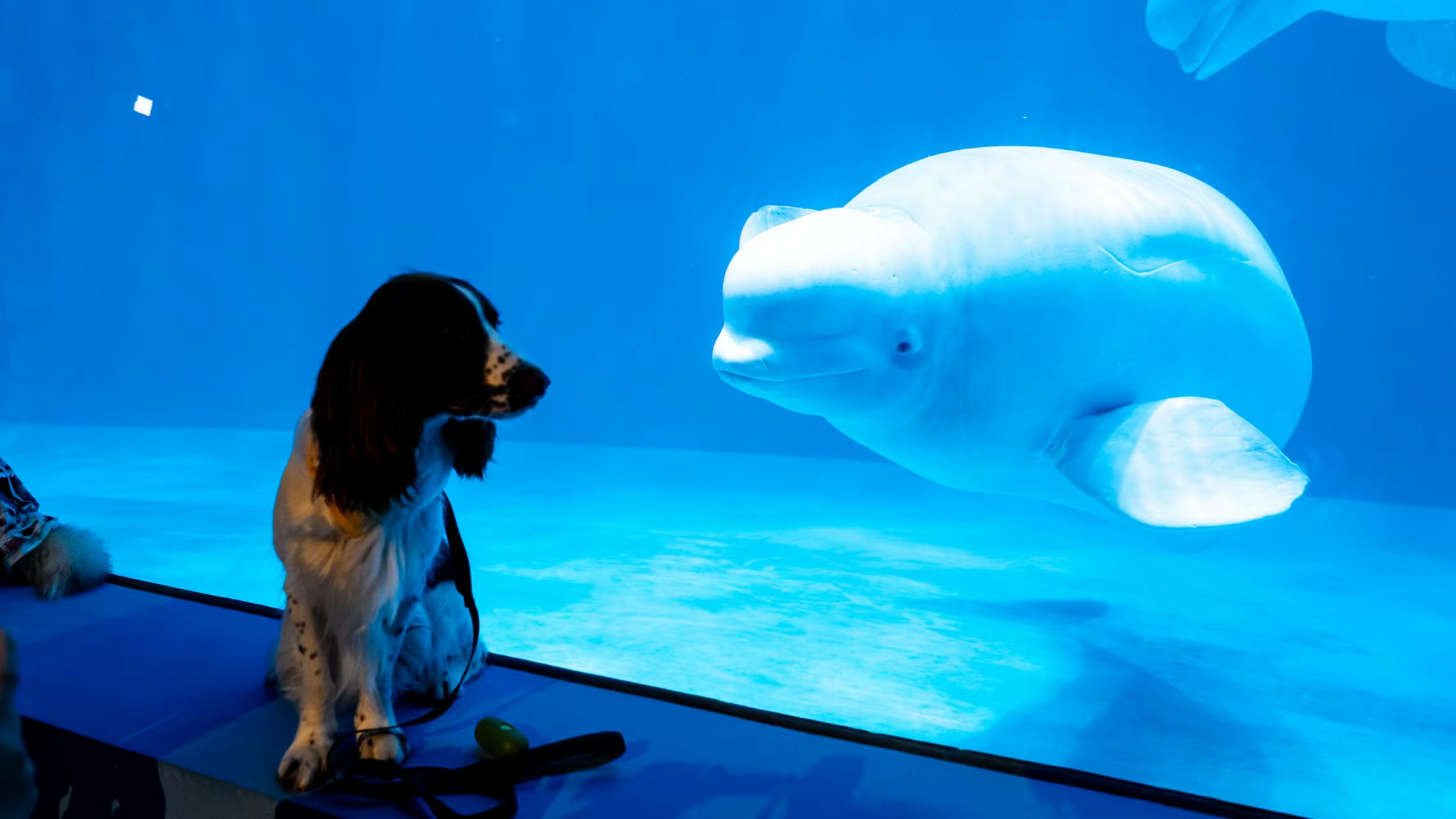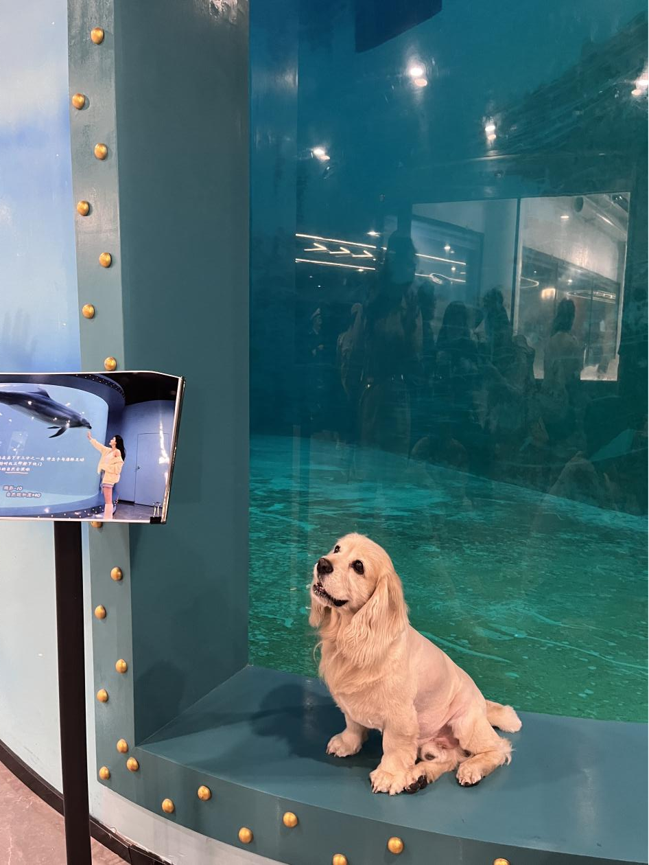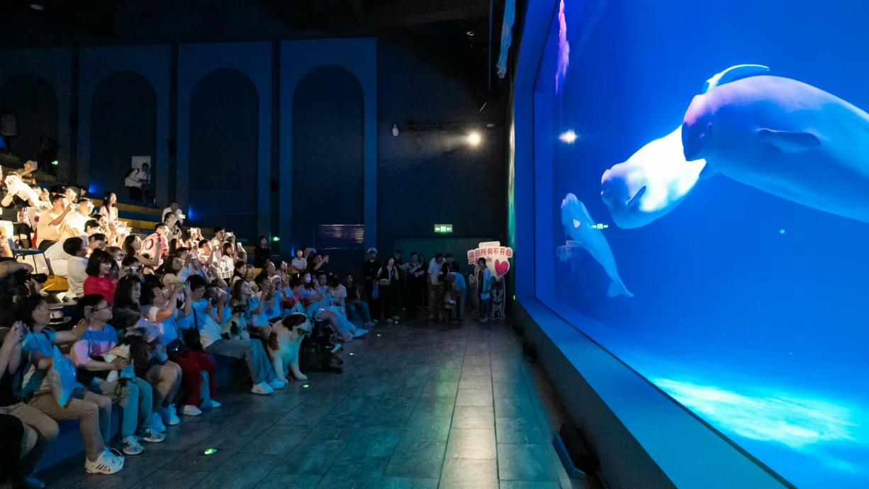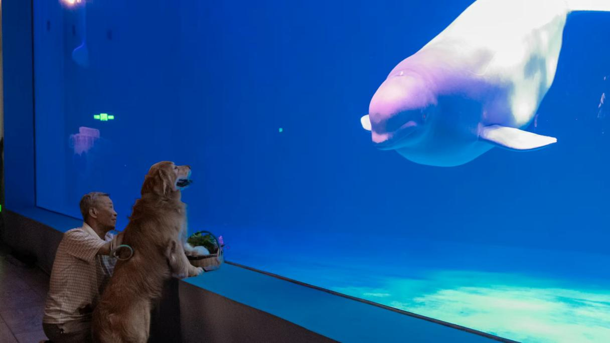 活动的一大亮点在白鲸剧场。景区特别设置“影院模式”,宠物主携爱犬共同观赏了曾获评“全球50大历史时刻”的世界首创极地白鲸水下表演“海洋之心”。萌宠们以吠叫、专注凝视等独特方式回应表演,与水中白鲸进行了一场趣味十足的“隔空交流”。