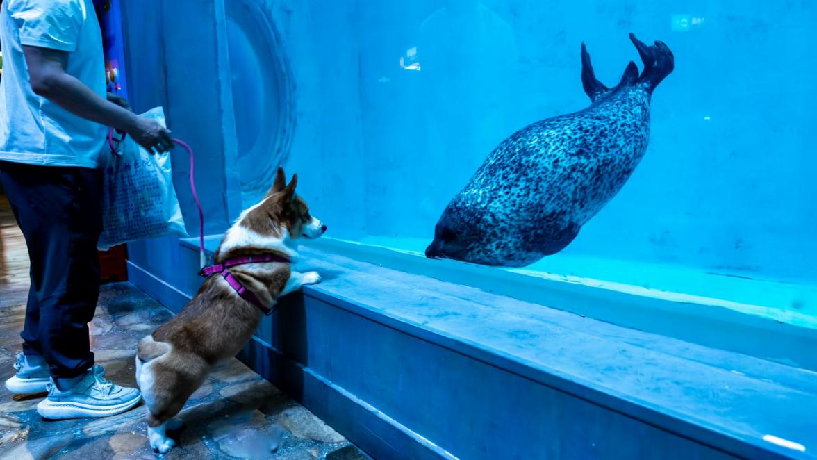 萌宠团队还畅游了极地公园。它们与北极狼、北极狐隔窗互动,感受着极地动物的独特魅力。更有趣的是,它们还惊动了海里的“小狗”——斑海豹。斑海豹摆动着身体,和陆地上的萌宠小狗隔窗相望,仿佛在进行一场跨物种的“对话”。市民马女士带着自己的哈士奇犬参与了活动,她说:“我听说极地公园有萌宠友好日这个活动就赶紧报了名,难得能有和小狗一起游玩极地的机会,能感觉到它很开心,在景区里它表现得很好,情绪很稳定,就是看到北极狼的时候情绪稍微有点小波动,可能是觉得看到同宗了。”