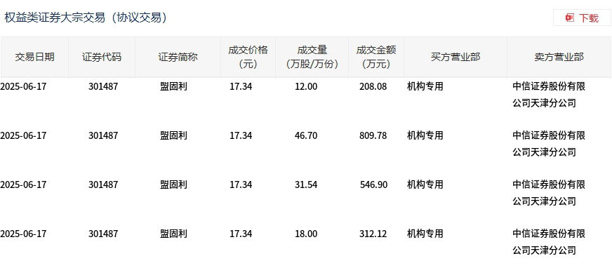 6月17日,盟固利大宗交易成交108.24万股,成交额1876.88万元,占当日总成交额的4.28%,成交价17.34元,较市场收盘价19.86元折价12.69%。