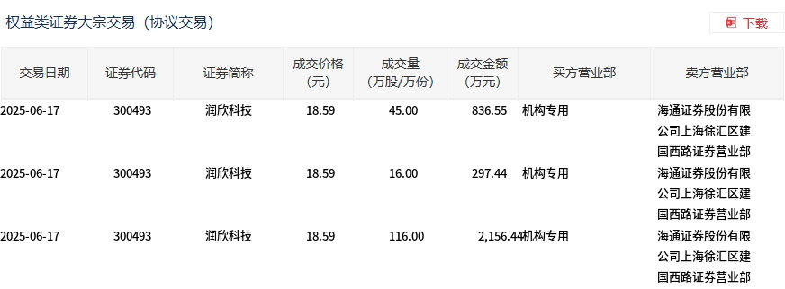 6月17日,润欣科技大宗交易成交177万股,成交额3290.43万元,占当日总成交额的2.59%,成交价18.59元,较市场收盘价21.19元折价12.27%。