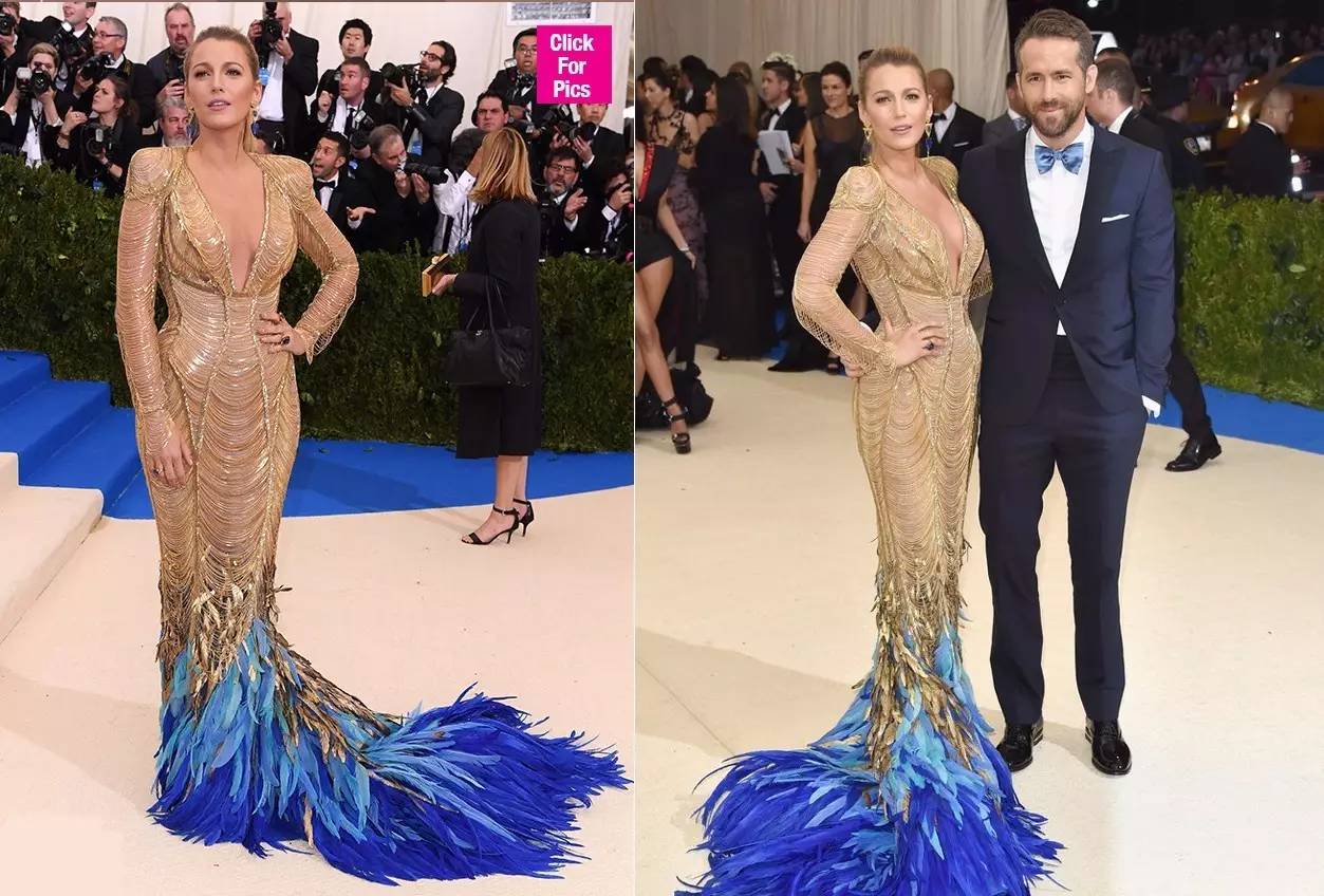 曾在《绯闻女孩》(Gossip Girl)中饰演时尚辣妹Queen S的布莱克在现实生活中也是一位走在时尚尖端的辣妈。在今年的Met Gala红毯上,她身穿金色透视拖尾长裙和老公瑞安·雷诺兹 (Ryan Reynolds)甜蜜亮相,尾部的蓝色羽毛让她看起来就像一只金色雀,但却稍显丰腴。