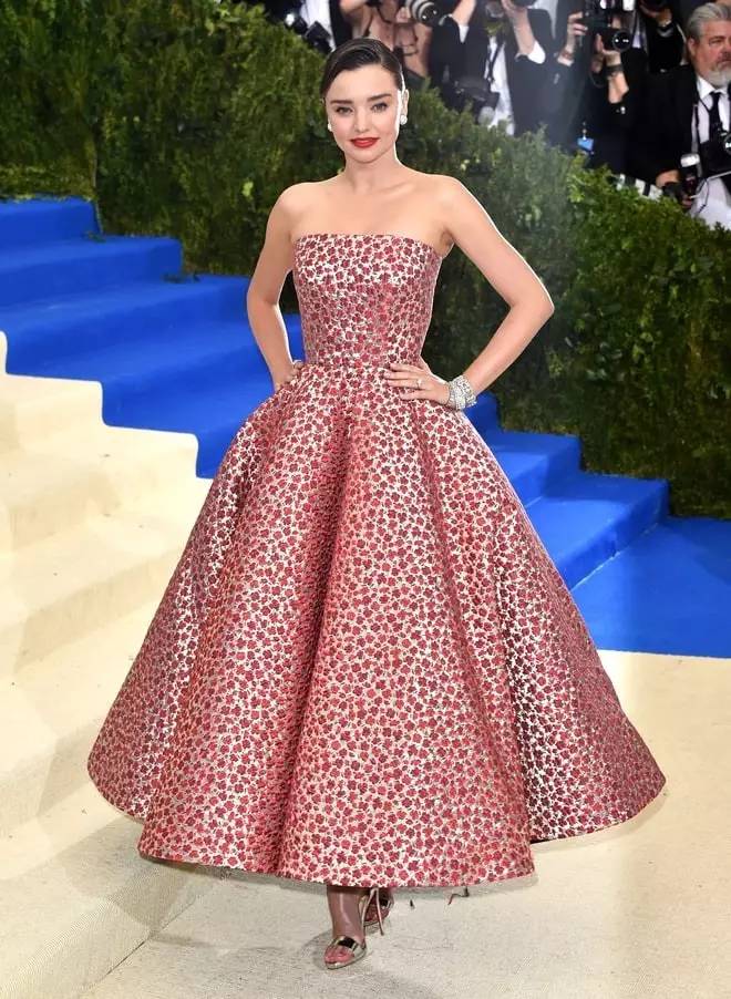 甜姐儿米兰达·可儿身穿粉色花朵刺绣抹胸蓬蓬裙,搭配一字带银色高跟凉鞋,洋溢着青春气息,宛如童话里的公主;恰到好处的首饰点缀和略带性感的红唇,加上迷人的双眼和蜜汁笑容,真是令人甜到入心了。