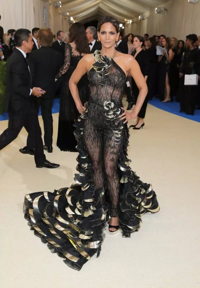 黑珍珠哈利·贝瑞这身造型充满未来感,黑色薄纱透露着性感,金属片凸显立体感,腰间的玫瑰花更是画龙点睛。黑纱和金属片本来相得益彰,但裙摆的金属片过多却让人感觉有点累赘,质感变得厚重,失分不少。