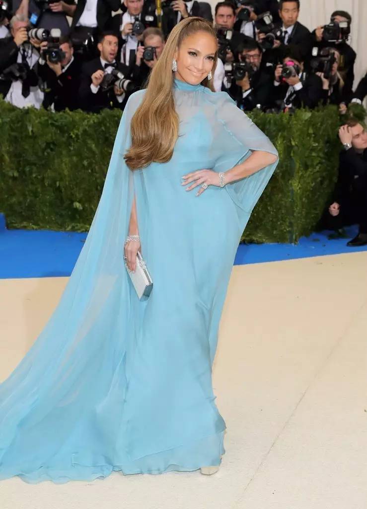 性感天后珍妮弗·洛佩兹一登场就气场十足,水蓝色轻纱连衣裙搭配复古发型,让珍妮弗看起来就像是从天而降的仙女,加上配饰和妆容的点缀,美丽而优雅。But!整体造型跟大会主题一点都不搭噶!