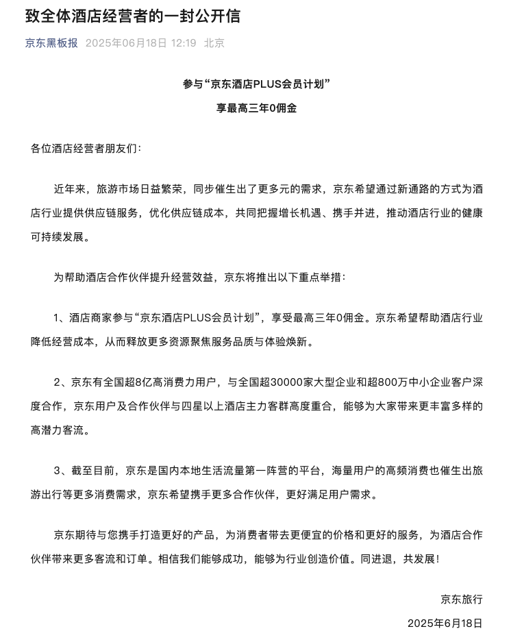 6月18日,京东旅行发布致全体酒店经营者的一封公开信。公开信显示,酒店商家参与“京东酒店PLUS会员计划”,享受最高三年0佣金。京东方面表示,希望通过新通路的方式为酒店行业提供供应链服务,优化供应链成本,共同把握增长机遇、携手并进,推动酒店行业的健康可持续发展。