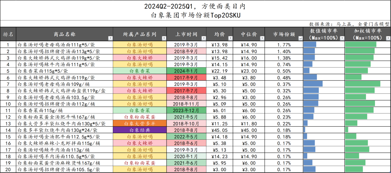 在2024Q2-2025Q1时间段内,方便面类目,白象集团市场份额TOP 20的SKU中,可以看到,排名第5的白象香菜面5连包与排名第11的白象香菜面桶装,均是由白象集团率先进行口味类型产品创新与规模化的营销推广。在2024年年初,白象香菜面上市时曾经风靡一时,在创意、营销等方面也均收获到了相当好的市场反响,其市场销售表现也可圈可点,可谓是“叫好又叫座”。