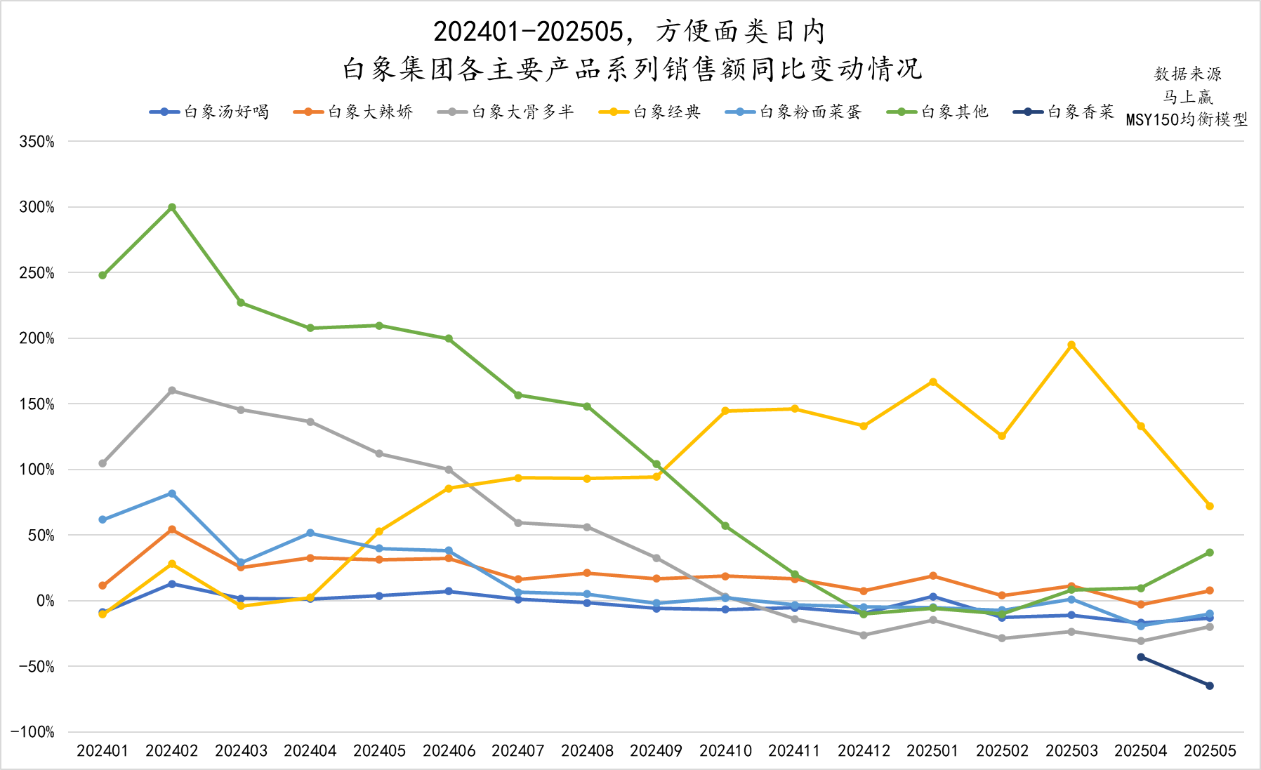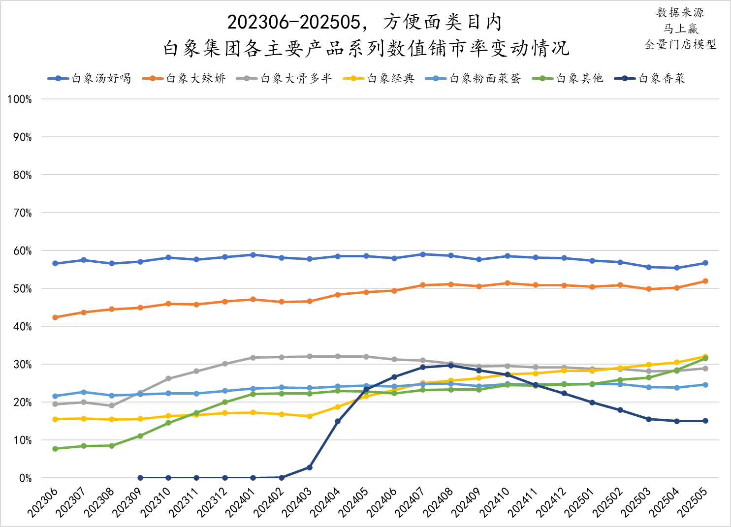 为了进一步观察白象集团正在发生的变化,我们选择了白象集团近两年(202306-202505)中,在方便面类目中市场份额较高的七个产品系列,按照期内整体的市场份额排序分别是白象汤好喝、白象大辣娇、白象大骨多半、白象经典、白象粉面菜蛋、白象其他、白象香菜。在白象集团中,上述七个系列在白象集团整体在方便面类目中的市场份额占比超过95%。