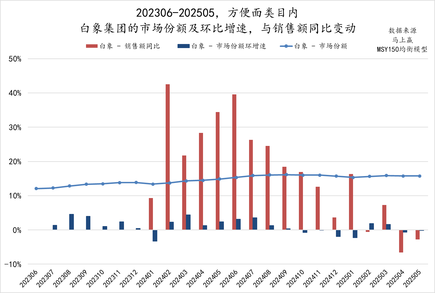 可以看到,从202306到202505的时间段中,白象集团在方便面类目中的市场份额一直处于上升通道中,从大约12%左右一路上升到15%~16%左右。从市场份额的环比增速来看,2024年上半年,白象集团的市场份额增长较为明显。2024年下半年,其市场份额增速放缓,偶尔出现微跌,但在2025年上半年,排除春节错位影响后,市场份额环比出现了小幅度的震荡。