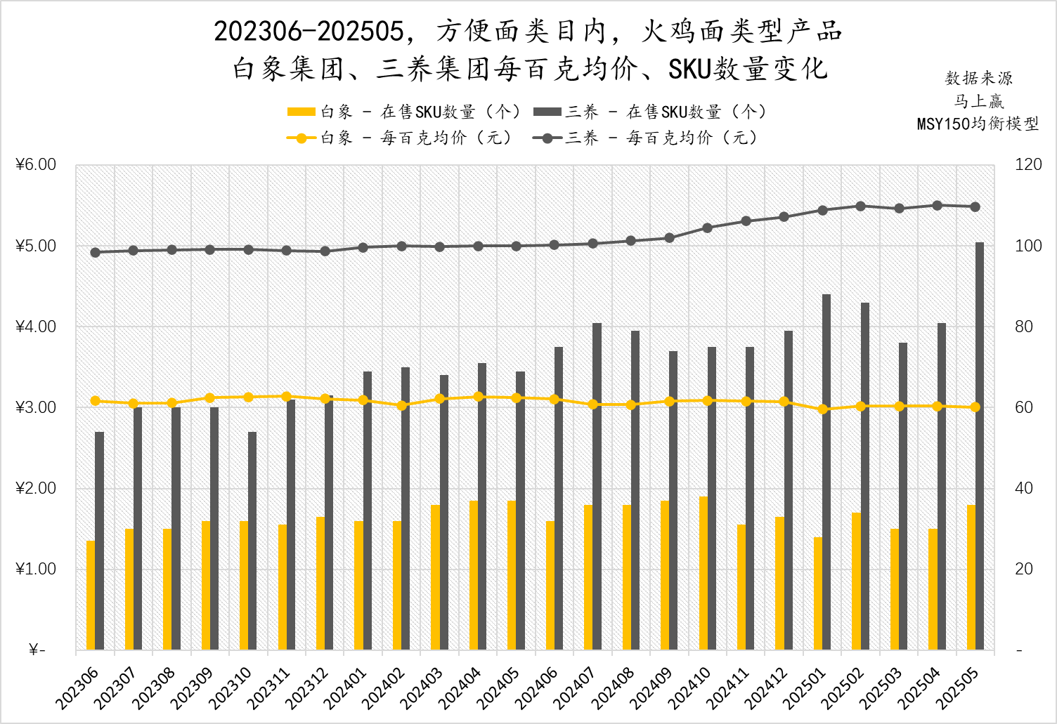在202306-202505这一时间段中,可以看到,白象的在售SKU数量规模有着较为显著的上升,且已经在2025年超过了今麦郎。其一方面意味着白象在产品推新上有着很强的动力,但另一方面,与今麦郎的情况类似,白象集团也是通过高于统一集团近一倍的SKU数量,实现与统一的“无限接近”。SKU数量规模越大,对于产品管理、渠道运营等能力的要求就越高,且这种要求的提升通常不是线性相关提升而是指数级别的提升,如果管理能力、运营能力无法达到SKU规模的要求,则可能面临着更多的压货窜货、价盘管控失效、渠道效率降低等问题,从而对于整体的销售带来相当大的、长期性的负面影响。