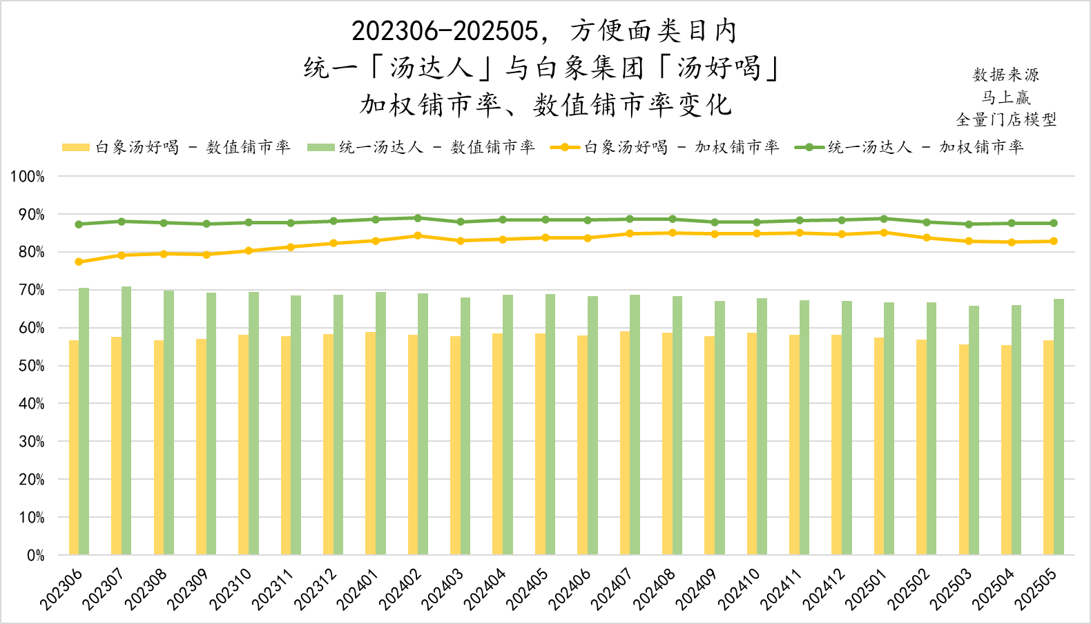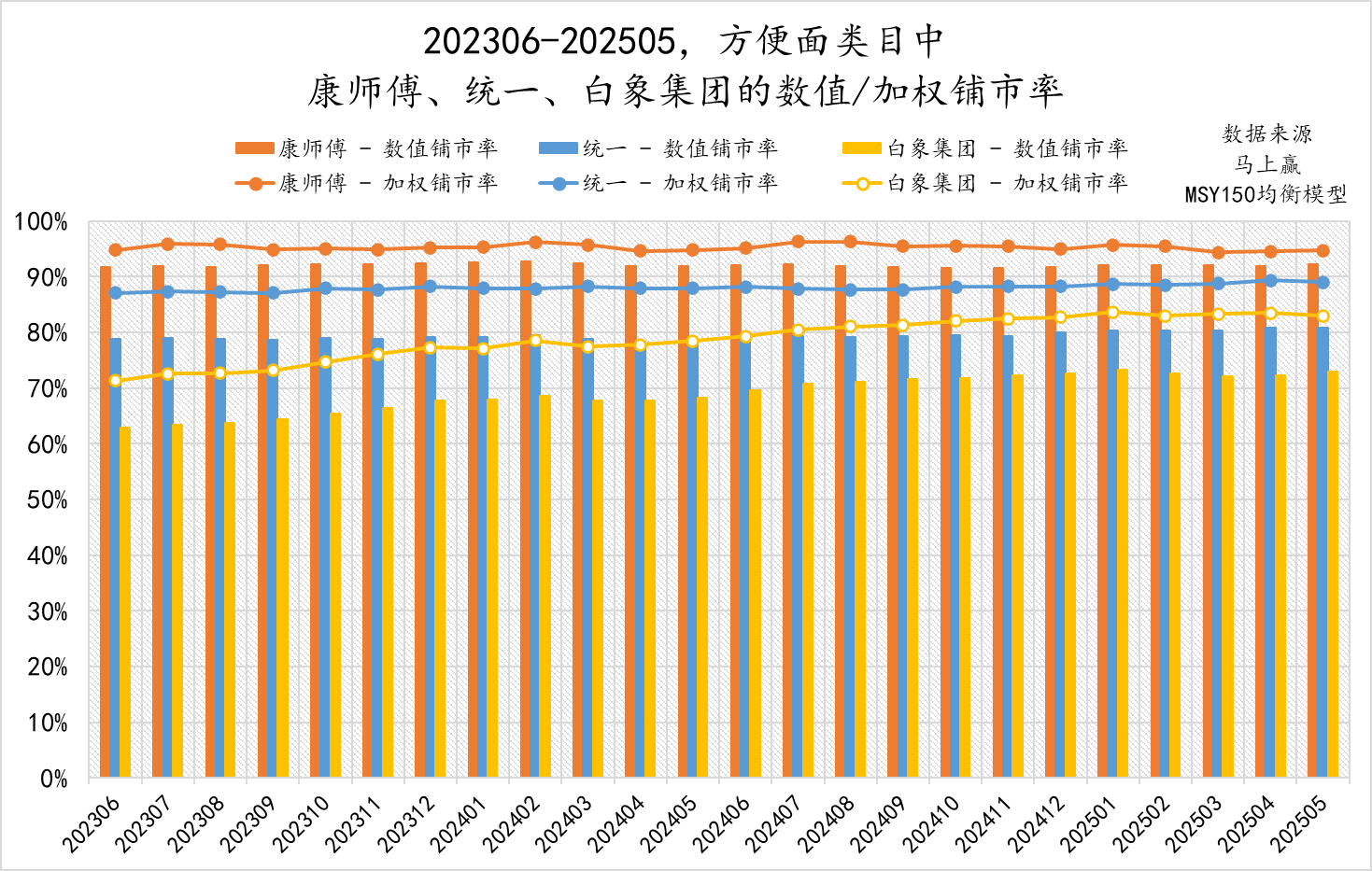 作为方便面类目中的集团CR3,从康师傅、统一、白象的铺市率情况上可以看到,从202306~202505,白象集团的数值铺市率、加权铺市率一直处于上升通道当中,其铺市率水平整体也处于较高的位置,数值铺市率从超过60%发展到超过70%、加权铺市率则从70%左右发展到微微超过80%。