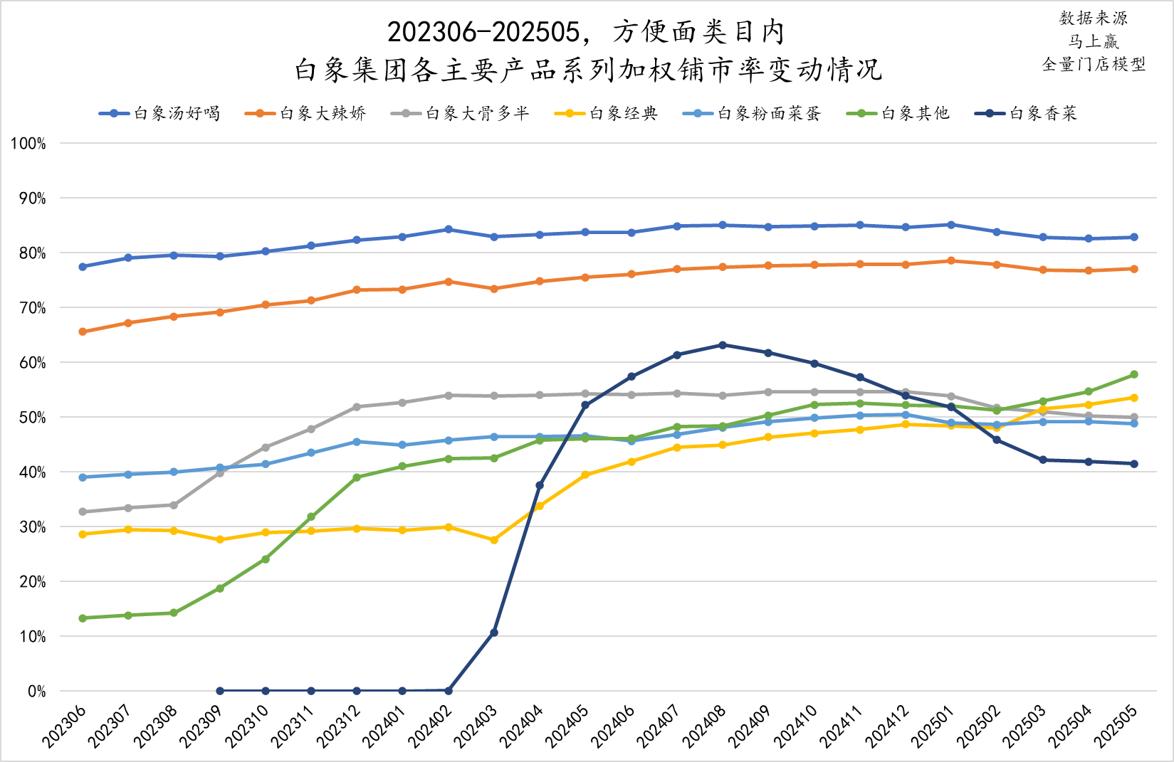 进一步分系列来看白象集团旗下各主要产品系列的数值铺市率、加权铺市率的变动情况。