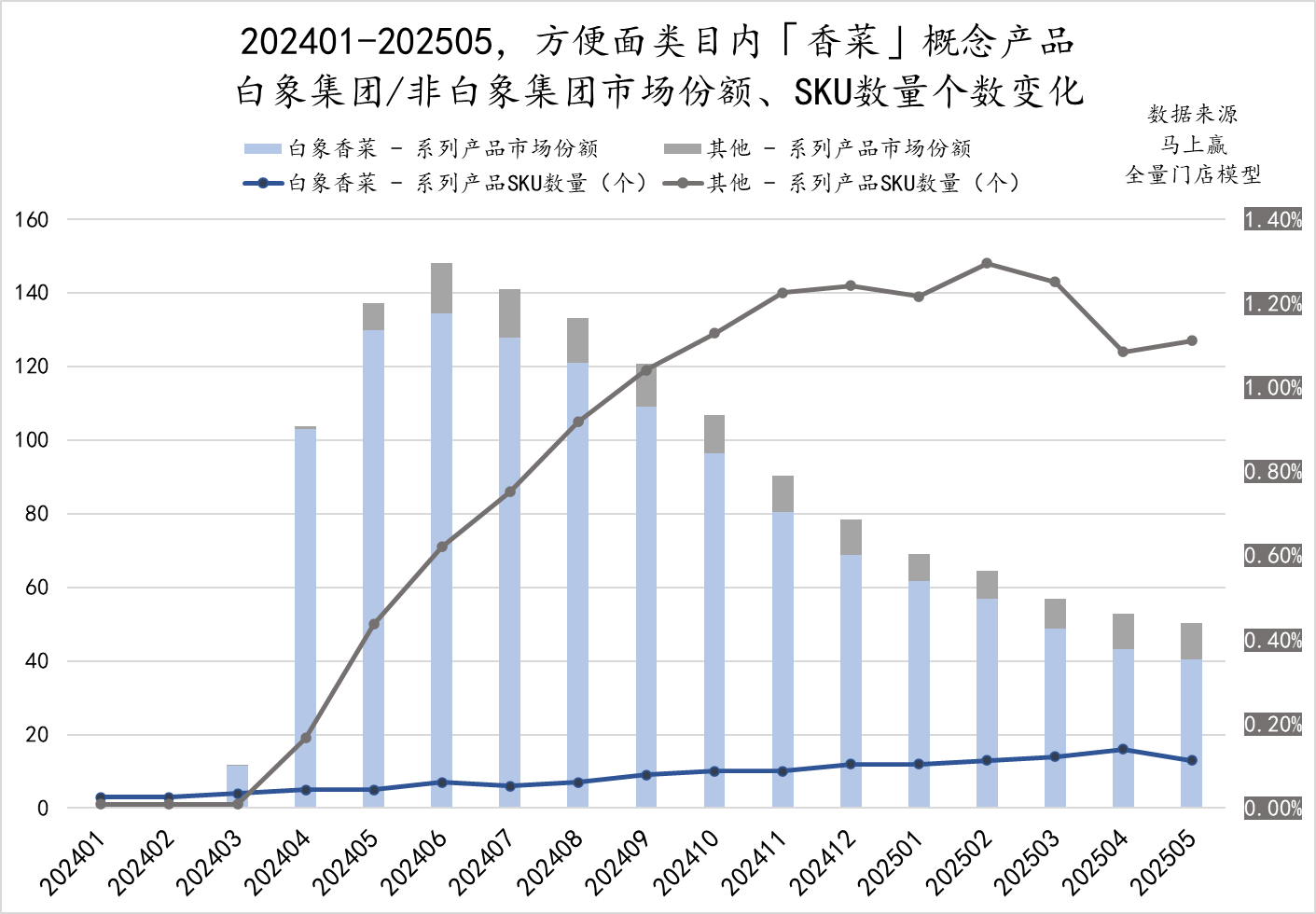可以看到,由白象集团引领并率先推向市场的“香菜”系列方便面产品,从2024年3月开始推广以来,白象的香菜系列产品SKU数量始终不多,但其在类型产品的市场份额中却始终占据着相当高的比重。相比来说,虽然香菜类型产品在2024年4月爆火以后,有更多的品牌、产品加入希望分一杯羹,其SKU数量规模也数倍于白象,但始终在香菜这一类型产品的市场份额上与白象差距显著。