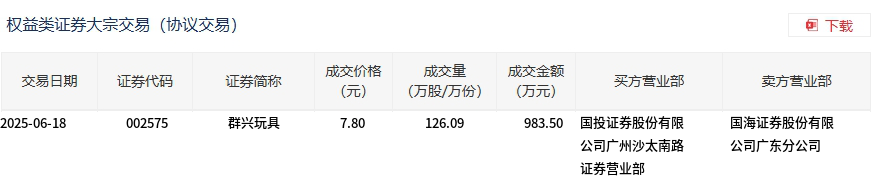 群兴玩具今日大宗交易折价成交126.09万股,成交额983.5万元