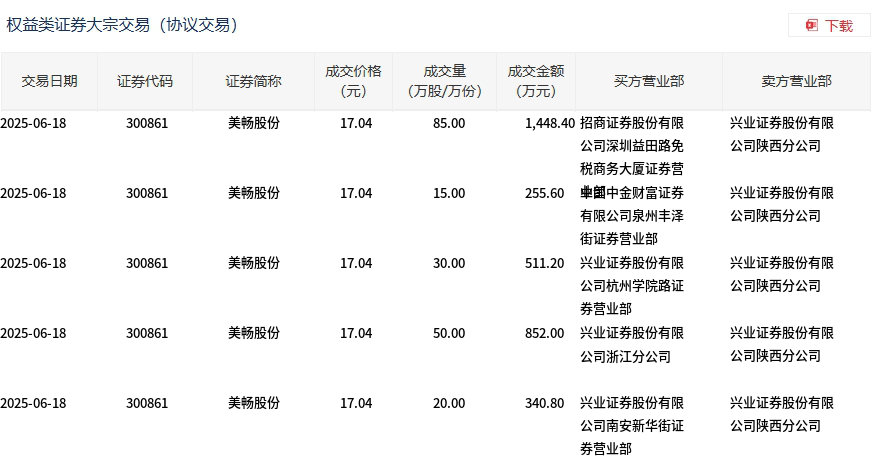 6月18日,美畅股份大宗交易成交200万股,成交额3408万元,占当日总成交额的51%,成交价17.04元,较市场收盘价18.52元折价7.99%。