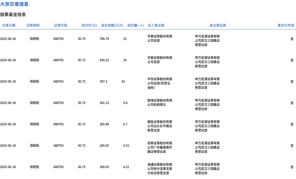 6月18日,倍轻松大宗交易成交76.52万股,成交额2351.45万元,占当日总成交额的19.75%,成交价30.73元,较市场收盘价36.15元折价14.99%。