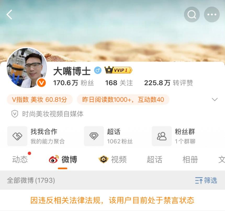 6月13日,据媒体报道,“大嘴博士”微博平台账号被禁言,多条视频已经下架。6月14日,「子弹财经」查询微博平台发现,“大嘴博士”微博账号“因违反相关法律法规,该用户目前处于禁言状态。”