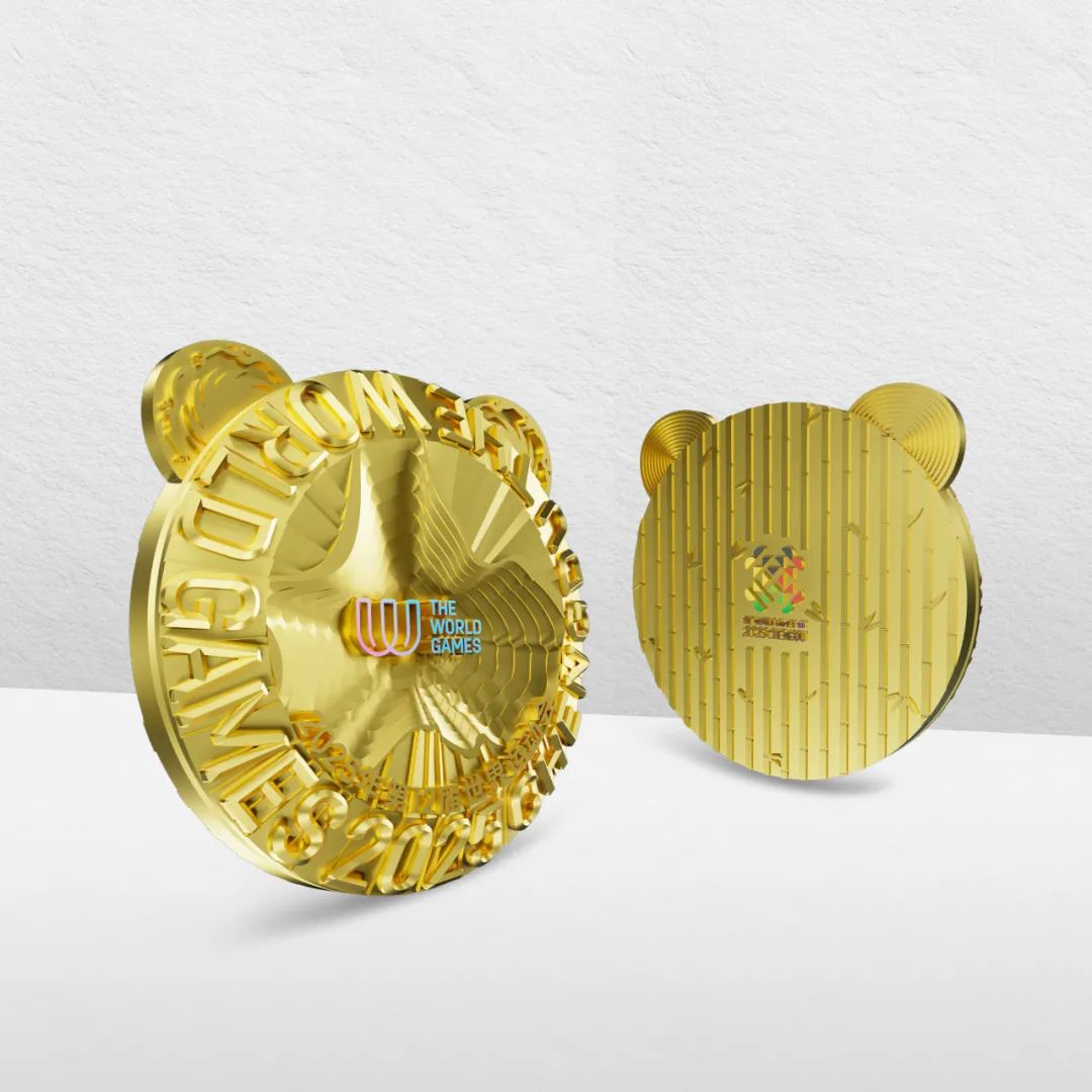 “竹光”奖牌的设计,深深植根于中国文化底蕴与成都独特魅力。奖牌正面,国际世运协会徽居中醒目,赛事中英文名称环绕呼应。巧妙融入的太阳神鸟纹饰,与暗合城市轮廓的流动凹凸线条,在底部营造出层层光芒,既彰显中华文明、巴蜀文化的璀璨历史,更象征着运动精神永恒闪耀。