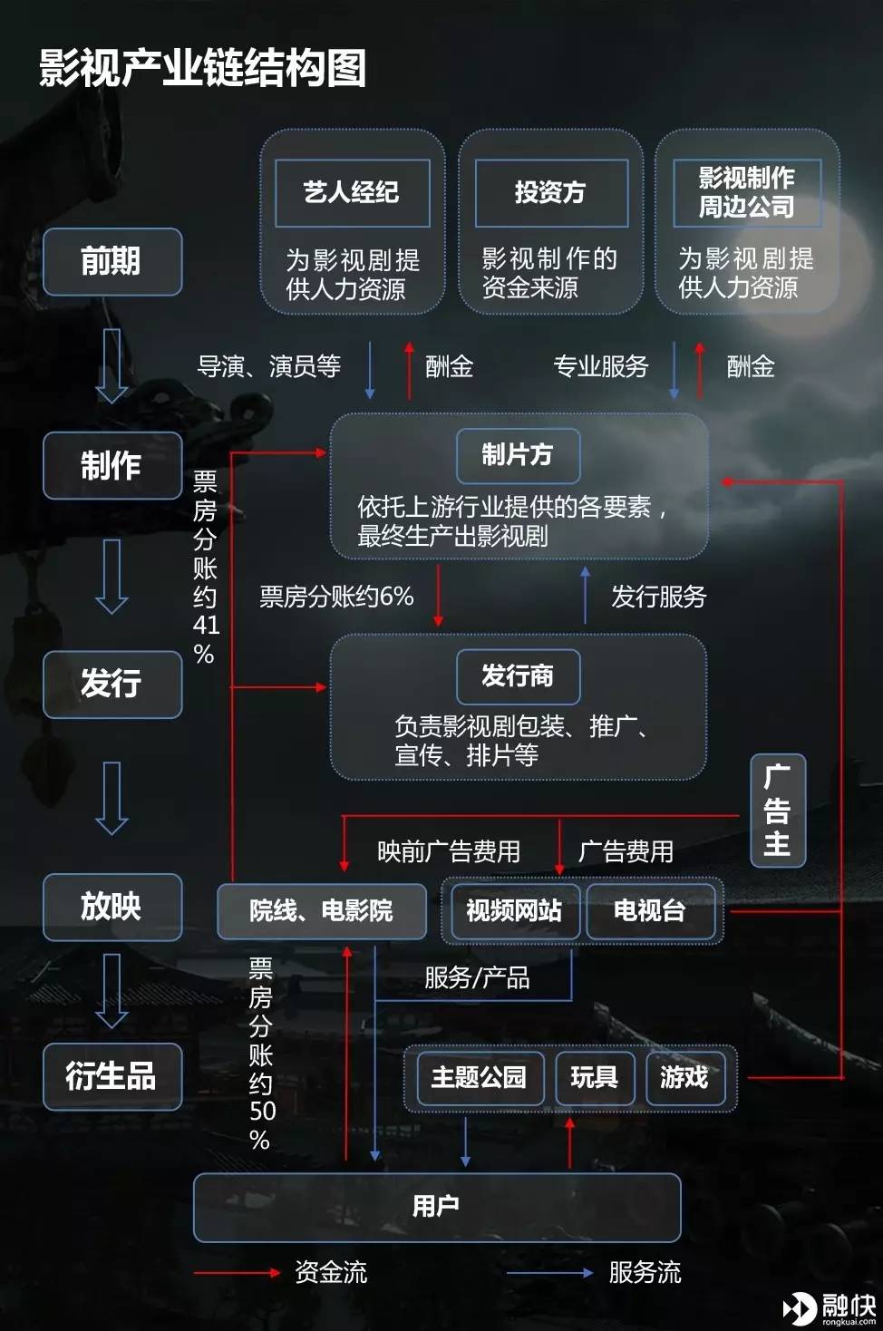 我们先来看一下影视产业的价值链,影视生产环节主要分为制作、发行、放映等环节;大数据把人们对因果关系的探究转向对相关关系的探究,海量数据背后代表着事物与事物之间的相关联系。