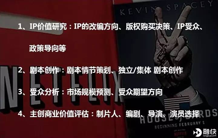 Netflix 花 1亿美元买下1990年美剧《纸牌屋》的版权,请来 David Fincher 和老戏骨 Kevin Spacey,首次改编原创剧集,一炮而红,在美国及亚洲等40 多个国家成为最热门的在线剧集。让全世界的文化产业界都意识到了大数据的力量。