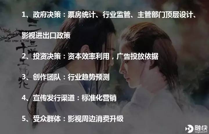 影视行业进入黄金时代,自然会吸引许多资本进入。现在投资者有了理论上的指导,进而做出更加精准的投资决策,从而降低风险,避免浪费。这对于整合影视行业而言无疑是起到了提升资本效率的作用。尤其值得注意的是,影视投资者越来越多是互联网玩家,BAT、乐视等内容巨头都开始投资影视。影视是一个长尾市场,利用大数据,面向特定用户群制作出好作品的几率更大。