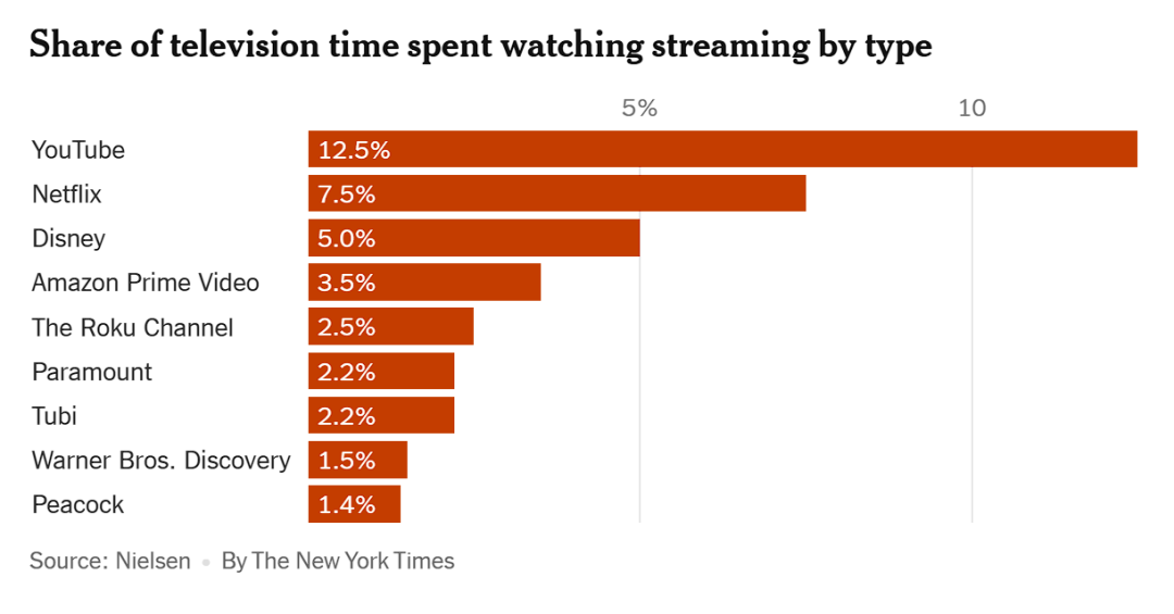 YouTube所有者谷歌同时也是Android生态的缔造者,在电视端提供了天然的原生用户体验,这也使得它正在成为一个电视优先的平台。公司首席执行官Neal Mohan透露,观众现在每天在电视上观看超过10亿小时的内容,超过了移动端和网页版观看量。根据尼尔森的数据,在过去两年里,YouTube一直是美国观看次数最多的流媒体服务。