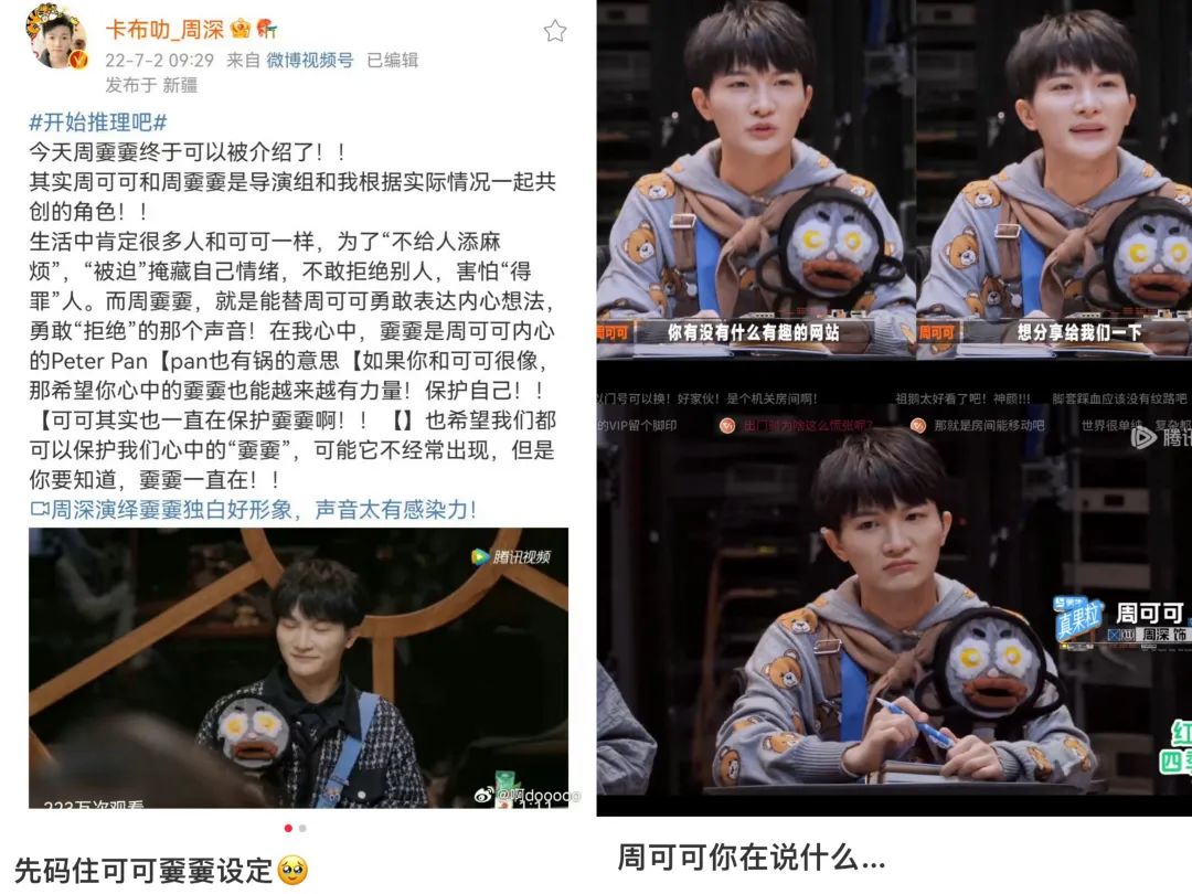 在“周可可”商标注册成立之前,“周可可”就已经是粉丝圈的“共识”。IP起源最早可追溯到2022年爆款综艺《开始推理吧》。节目中,周可可的形象和性格逐渐被塑造出来,深受观众喜爱。周嫑嫑则是周可可的分身。当时节目热播就有“想要买周边”的粉丝呼声。
