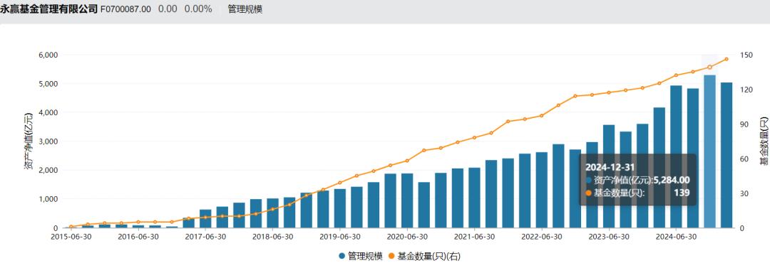 虽因市场环境变化出现短期波动,但永赢基金整体规模持续扩张。2017年至2024年末,7年增长超50倍,背后离不开高管团队战略的确定性。