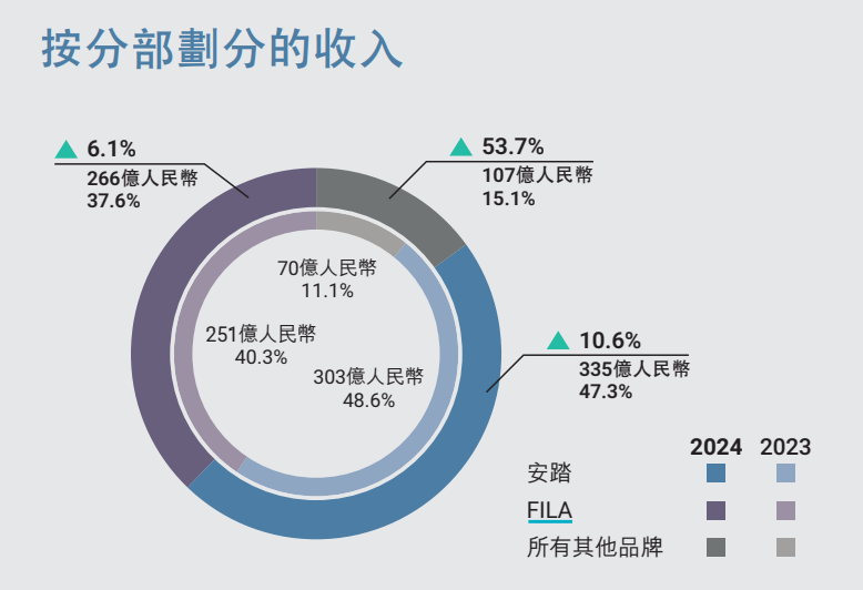 曾经占据安踏集团营收半壁江山的FILA,自2022年面临增长失速危机后业绩呈现波动增长。2024年,FILA收入同比微增6.1%至266.26亿元,经营利润同比减少2.6%至67.38亿元;2025年第一季度,FILA零售额与与2024年同期相比录得高单位数正增长。