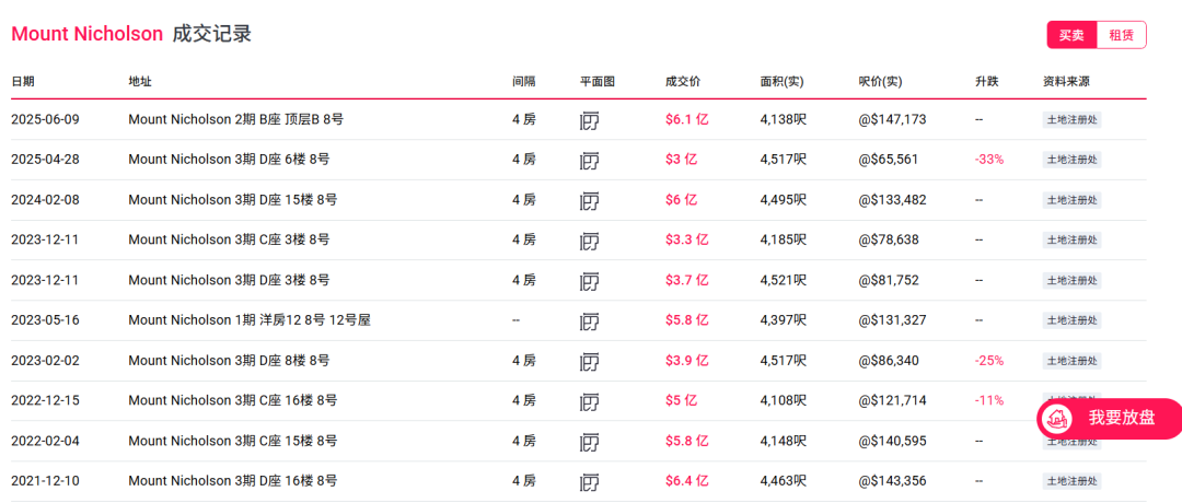 这不是MOUNT NICHOLSON首次创下纪录。2021年11月,该项目曾以每呎14.08万港元的价格售出16楼D室,创下当时亚洲最高呎价。如今时隔3年,随着6.09 亿港元总价出售,这个顶级豪宅项目的成交单价纪录又推高了3615港元,逼近15万港元大关。
