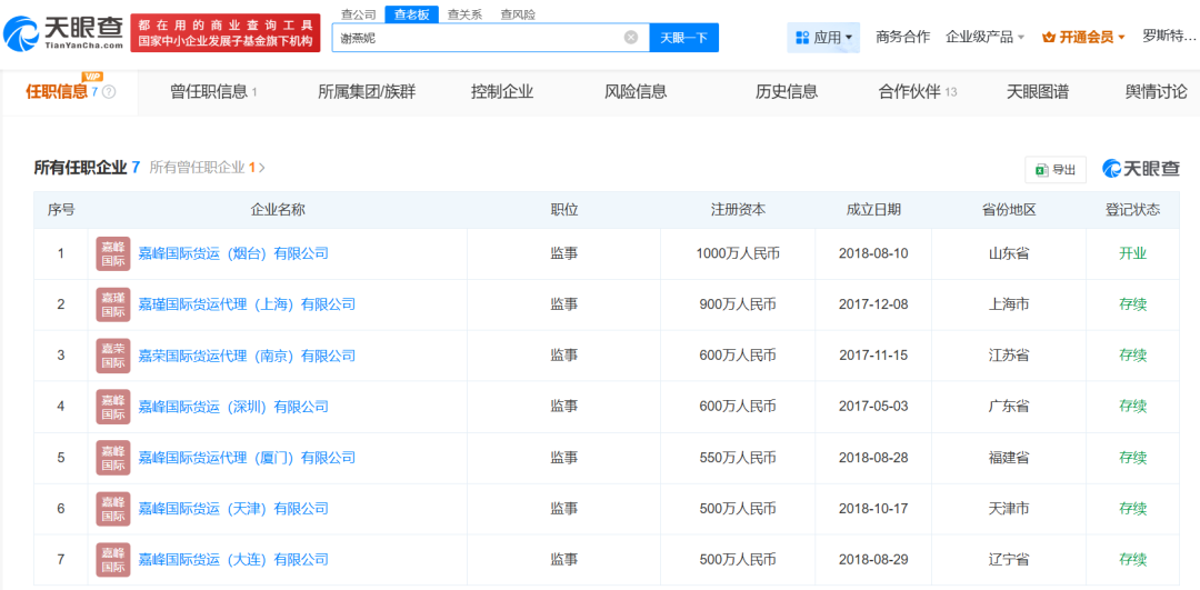 天眼查显示,目前谢燕妮在7家物流公司担任监事,其中5家公司是嘉峰国际货运的城市分公司或代理公司,其余2家为嘉荣国际货运代理(南京)有限公司、嘉瑾国际货运代理(上海)有限公司。