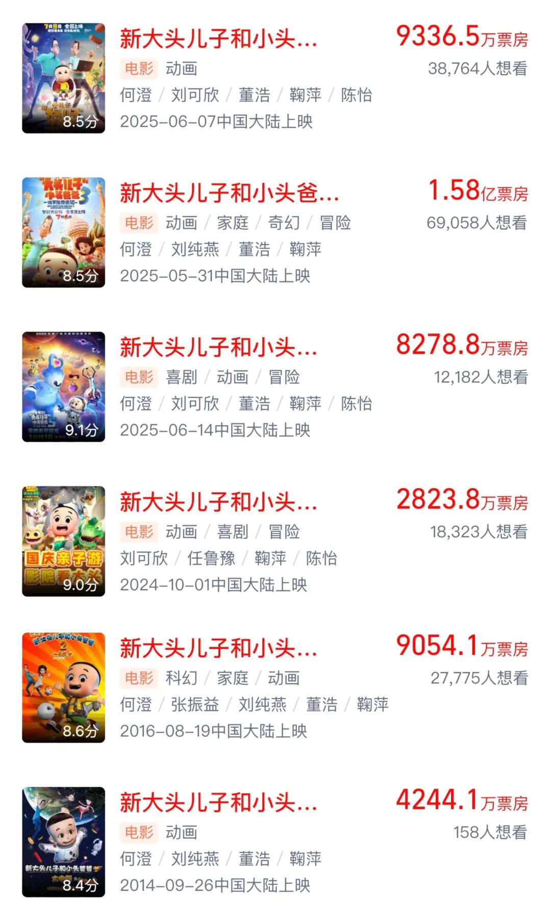 这个暑期档,央视动漫以《新大头儿子和小头爸爸4完美爸爸》《新大头儿子和小头爸爸5:我的外星朋友》2部重映作品率先入场,累计票房突破1.76亿元。目前,《新大头儿子和小头爸爸》共6部动画电影累计票房超4.95亿元,这一成绩不仅验证了低幼向国民IP的持久生命力,更揭示了国营厂的战略转型——通过系列化运作构建“动画宇宙”,将电视台积累的受众基础转化为院线基本盘。