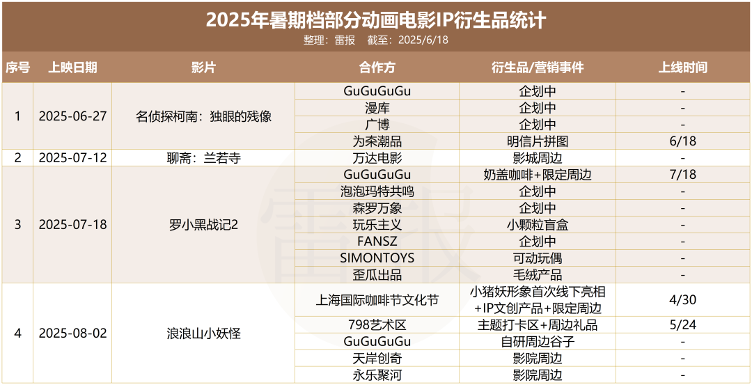 值得一提的是,《哪吒2》衍生品大卖的案例在前,头部动画IP的电影衍生品开发也逐渐趋于前置化(人工统计存在误差):