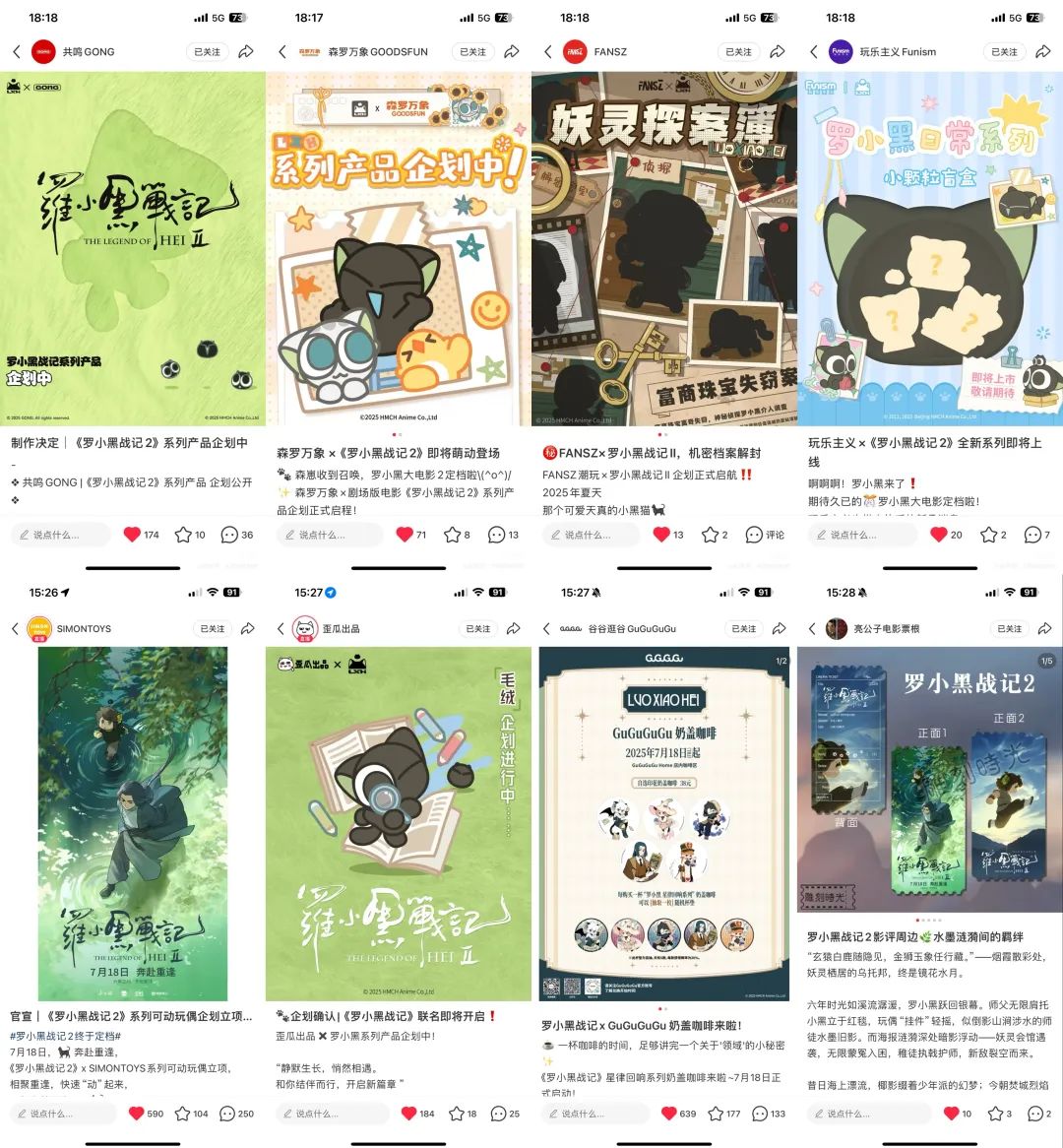 罗小黑IP持续耕耘周边衍生品业务,截至发稿日,《罗小黑战记2》已官宣了至少8个周边企划,合作方包括泡泡玛特共鸣、GuGuGuGu、森罗万象、玩乐主义、FANASZ、SIMONTOYS、歪瓜出品等,涉及主题餐饮、潮玩、盲盒、可动玩偶、毛绒、轻周边谷子等各种IP衍生品类,几乎覆盖Z世代所有主流二次元消费层级。