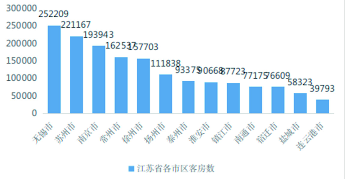 上述报告提到,江苏酒店现有客房数为1623063间。无锡同样位居第一,为252209间。苏州、南京、常州、徐州位居其后。