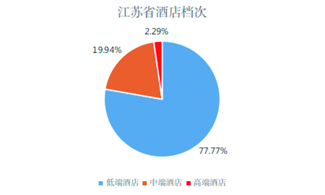 从酒店档次来看,江苏省酒店档次以低端酒店为主,占据全省酒店数量的 77.77%;中端酒店占 19.94%;高端酒店占比 2.29%。