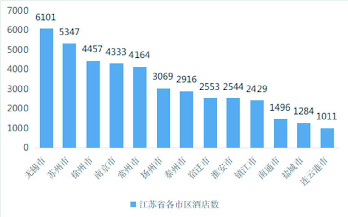 《2024中国酒店业发展规模现状大数据分析报告》显示,江苏省现有酒店数量总计41704 家,酒店数量由高到低排序分别为:无锡市 6101 家、苏州市 5347 家、徐州市 4457 家、南京市 4333 家、常州市 4164 家、扬州市 3069 家、泰州市 2916 家、宿迁市 2553 家、淮安市2544 家、镇江市 2429 家、南通市 1496 家、盐城市 1284 家、连云港市 1011 家。