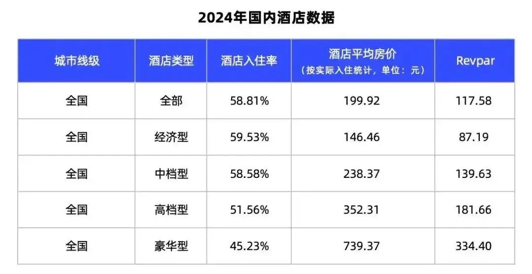 RevPAR(单间可售房间的收入)方面,华住集团2025年一季度财报,其RevPAR为208元/晚,同比下降4%,创2023年疫情恢复以来新低。2024年,国内酒店业的平均房价有所回落,整体RevPAR为118元,同比下降9.7%。