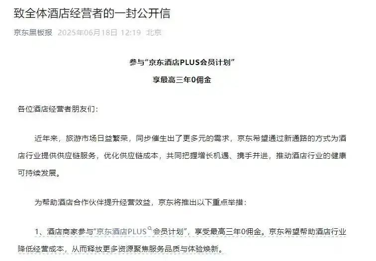 6月18日当天,以一封公开信高调宣布了“京东酒店PLUS会员计划”。