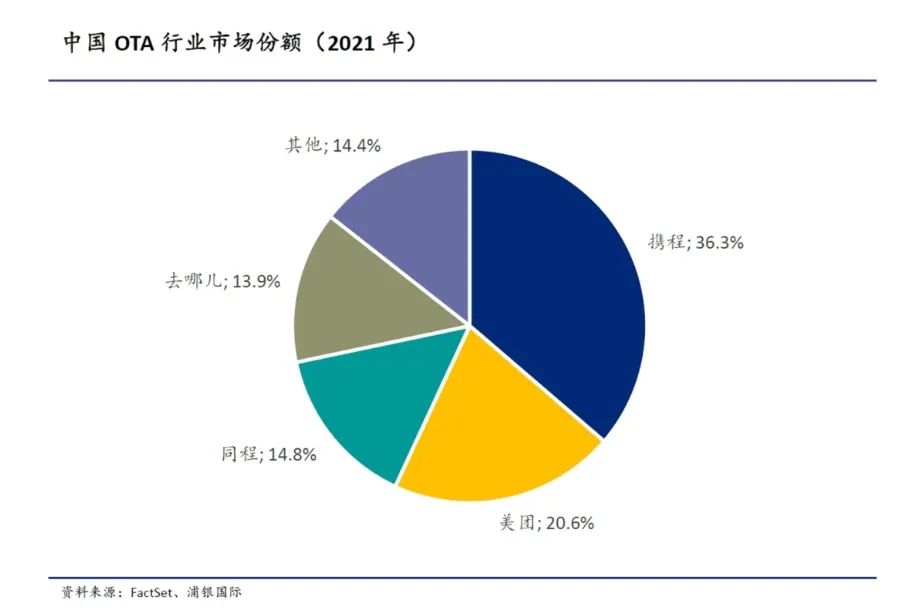 但在OTA领域,头部效应更加明显。有关OTA的市场份额,目前机构普遍采用的是2021年以GMV计算的市场份额,携程+去哪儿占据了市场份额的约5成。此外还有市场份额也超过10%的同程旅行,虽然其最大股东虽然是腾讯,但携程也已对其注资,外界有时也将会将其视为“携程系”。