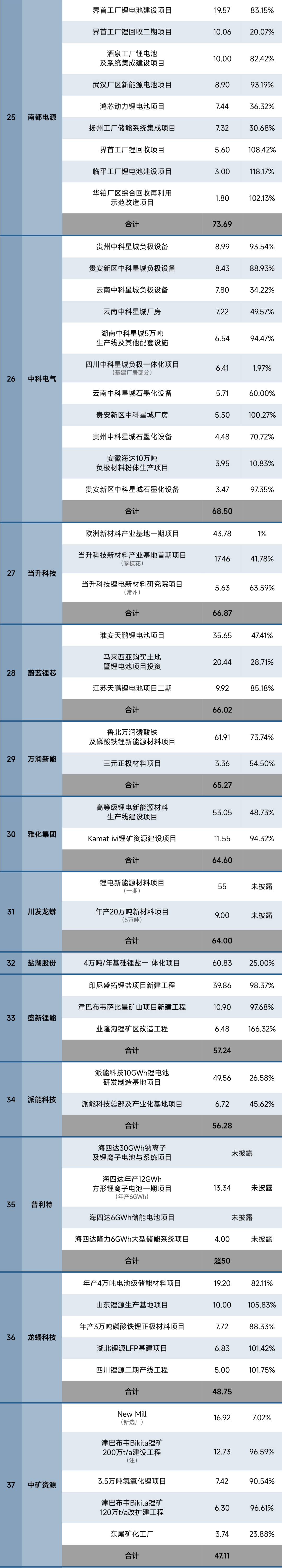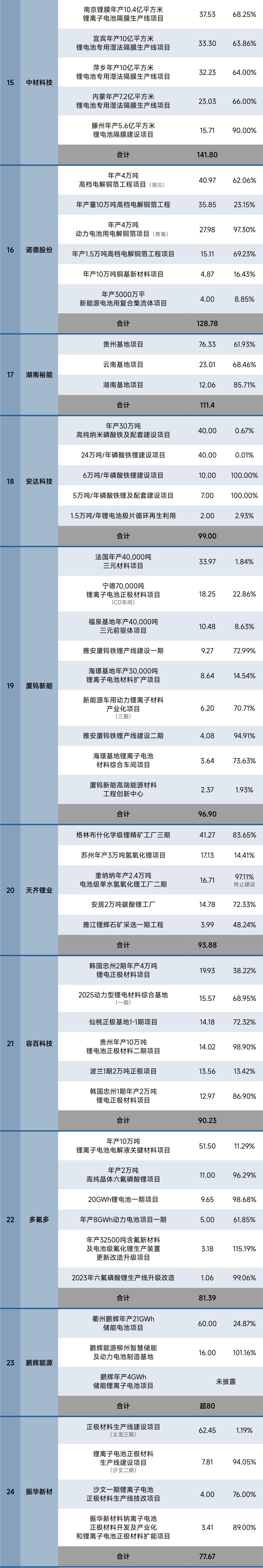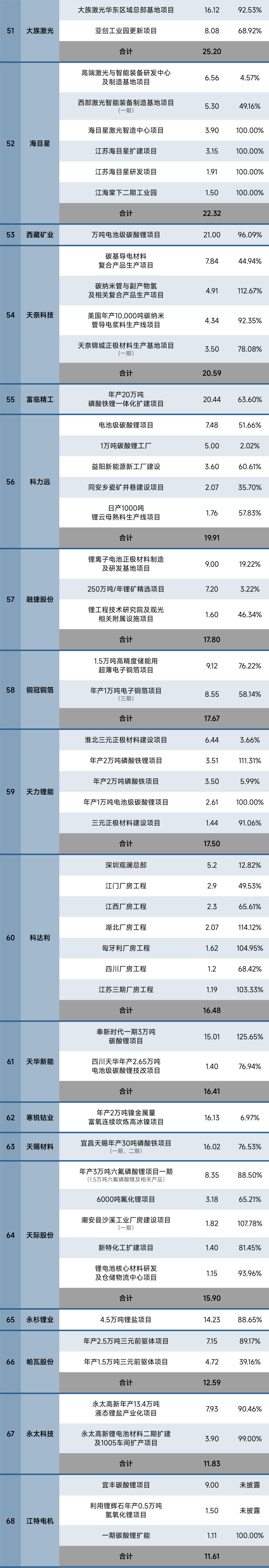 据24潮产业研究院(TTIR)统计,截止2024年末,国内仅83家锂电上市公司超320个超级工程(单个项目投资预算在亿元以上)进入执行(施工)阶段,项目总投资预算超10000亿元,约同比增长28%。涵盖动力与储能电池制造、钴锂镍等上游原材料、正负极材料、电解液、锂电隔膜、锂电铜箔等整个锂电产业链。